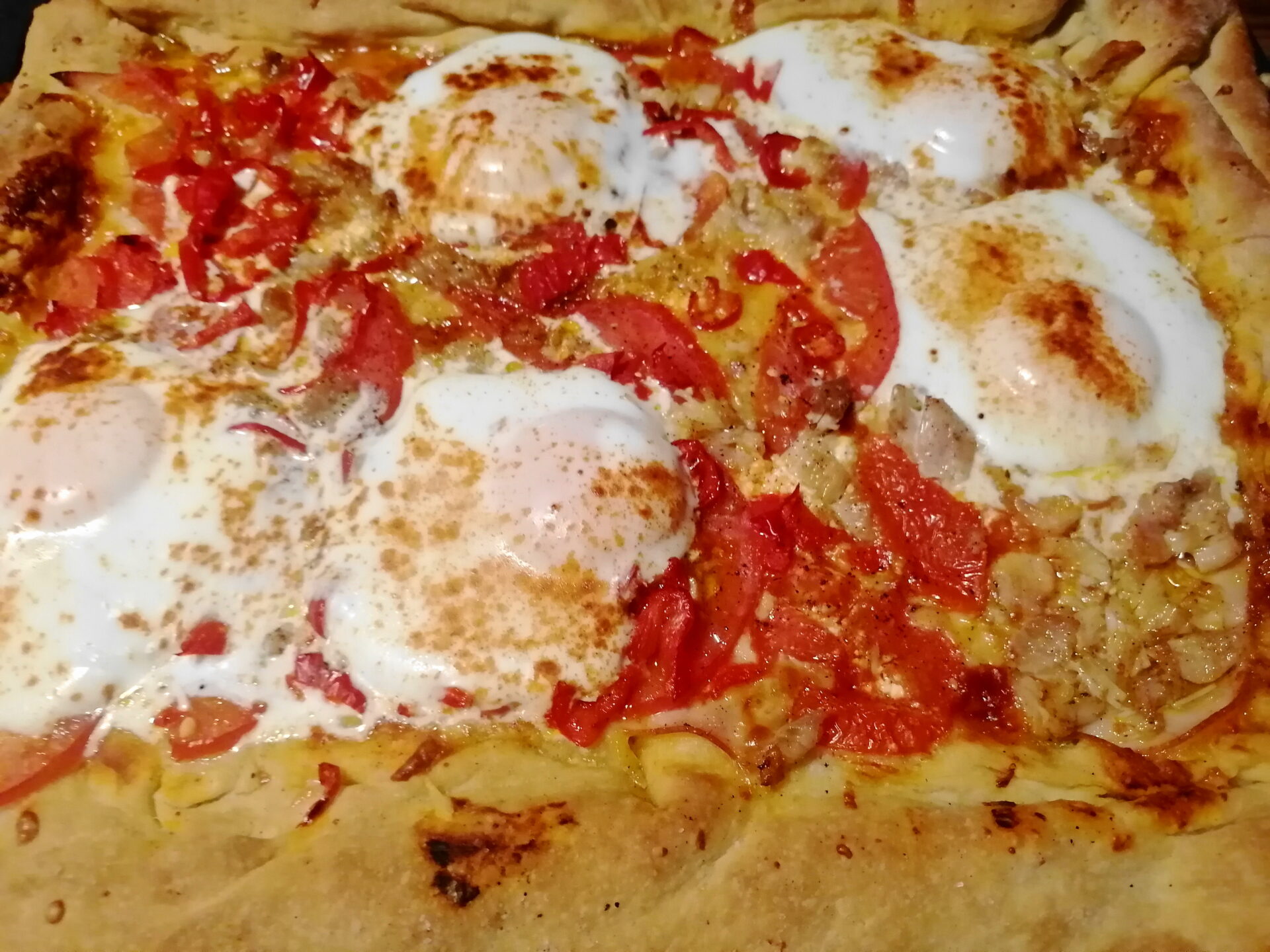 - Στα τελευταία 5' βγάζουμε την πίτσα από τον φούρνο, σπάμε προσεχτικά ένα ένα τα αυγά από πάνω και βάζουμε την πίτσα μας ξανά στον φούρνο.