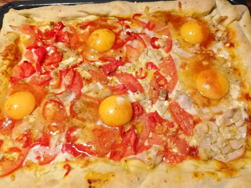- Στα τελευταία 5' βγάζουμε την πίτσα από τον φούρνο, σπάμε προσεχτικά ένα ένα τα αυγά από πάνω και βάζουμε την πίτσα μας ξανά στον φούρνο.