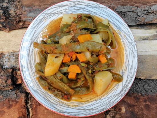 Едно лятно ястие с пържени пресни чушки и патладжани, потопени в доматена салца .