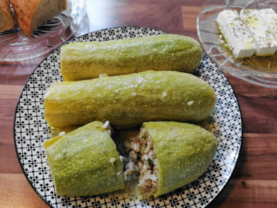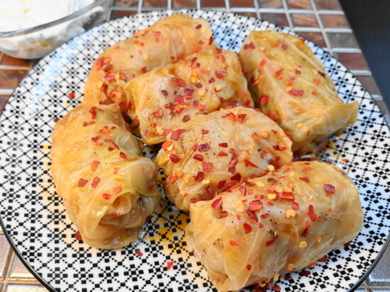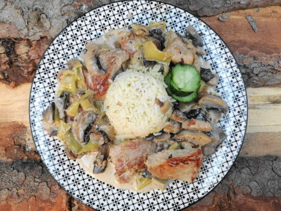 Късчета от пържоли с гъби и зелени чушки, поляти с готварска сметана.