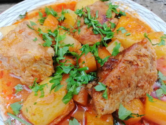 Χοιρινό κατσαρόλας σε συνδυασμό με πατάτες, καρότα και ντοματούλα. Χορταστικό και πολύ νόστιμο φαγητό για το καθημερινό μας τραπέζι.