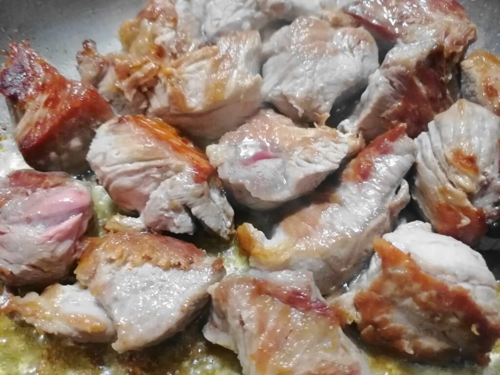 Μόλις ζεσταθεί βάζουμε ένα ένα τα κομμάτια χοιρινού.